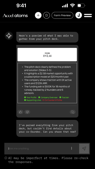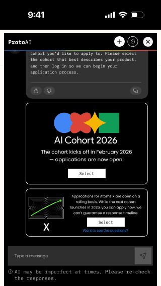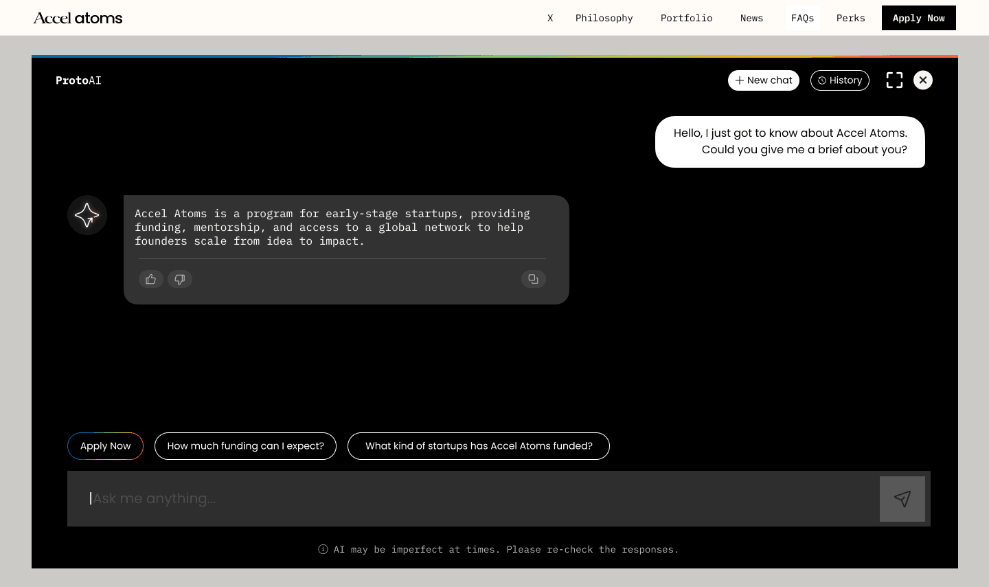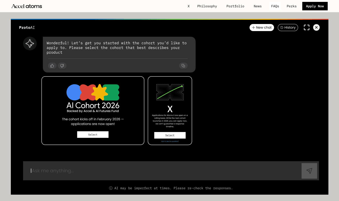 The chatbot interface had to feel like it was built by Accel and Google, not licensed from a third party. Visual language, micro-interactions, type — all aligned with the identity system.