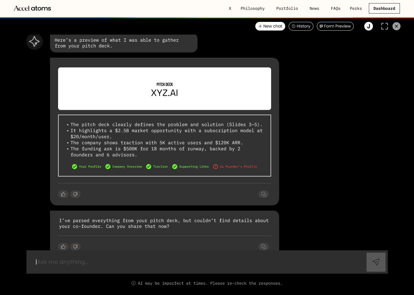 Every interaction should give the founder something back — a clearer picture of their company, a better understanding of fit. Not just a progress bar.