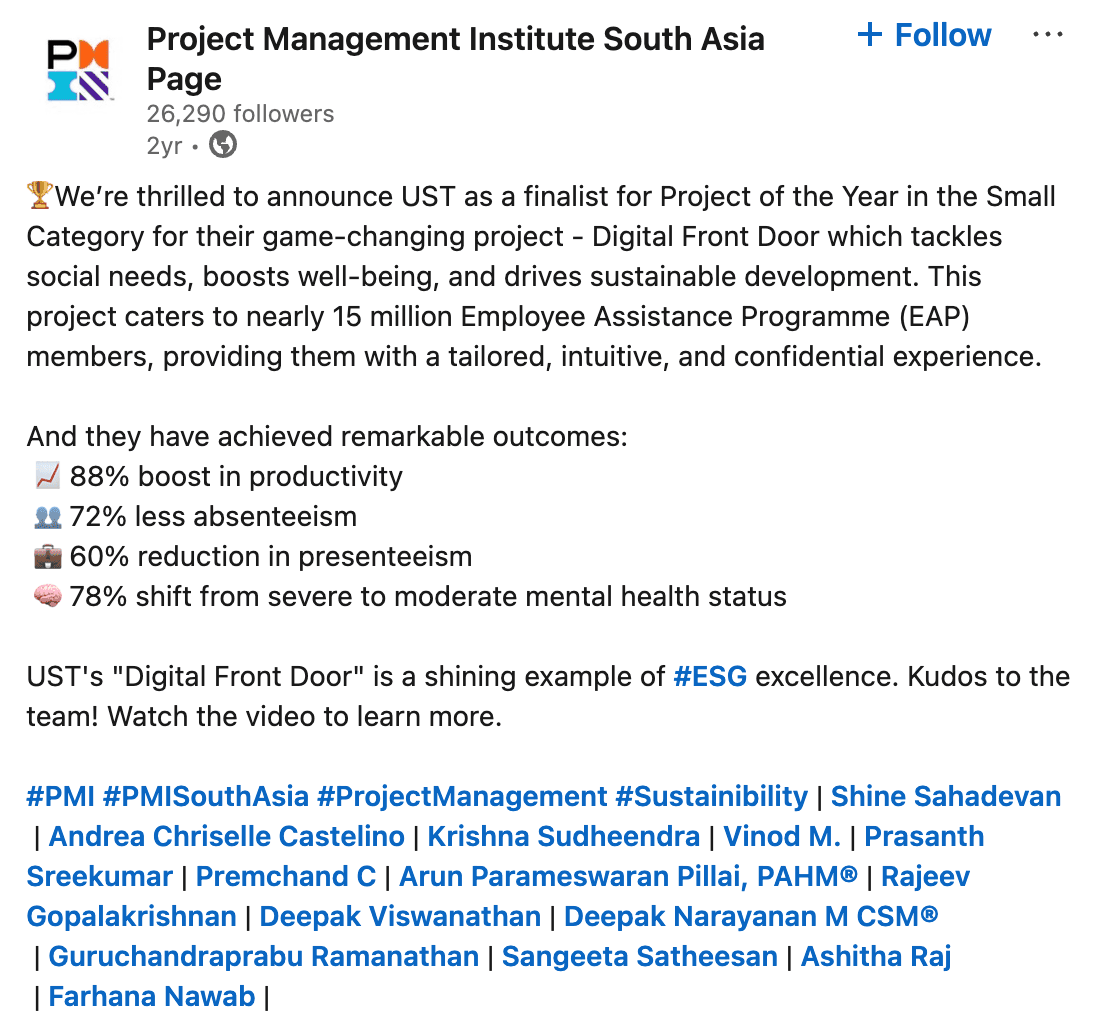 88% boost in productivity · 72% reduction in absenteeism · 78% shift from severe to moderate mental health status — finalist, Project Management Institute South Asia.