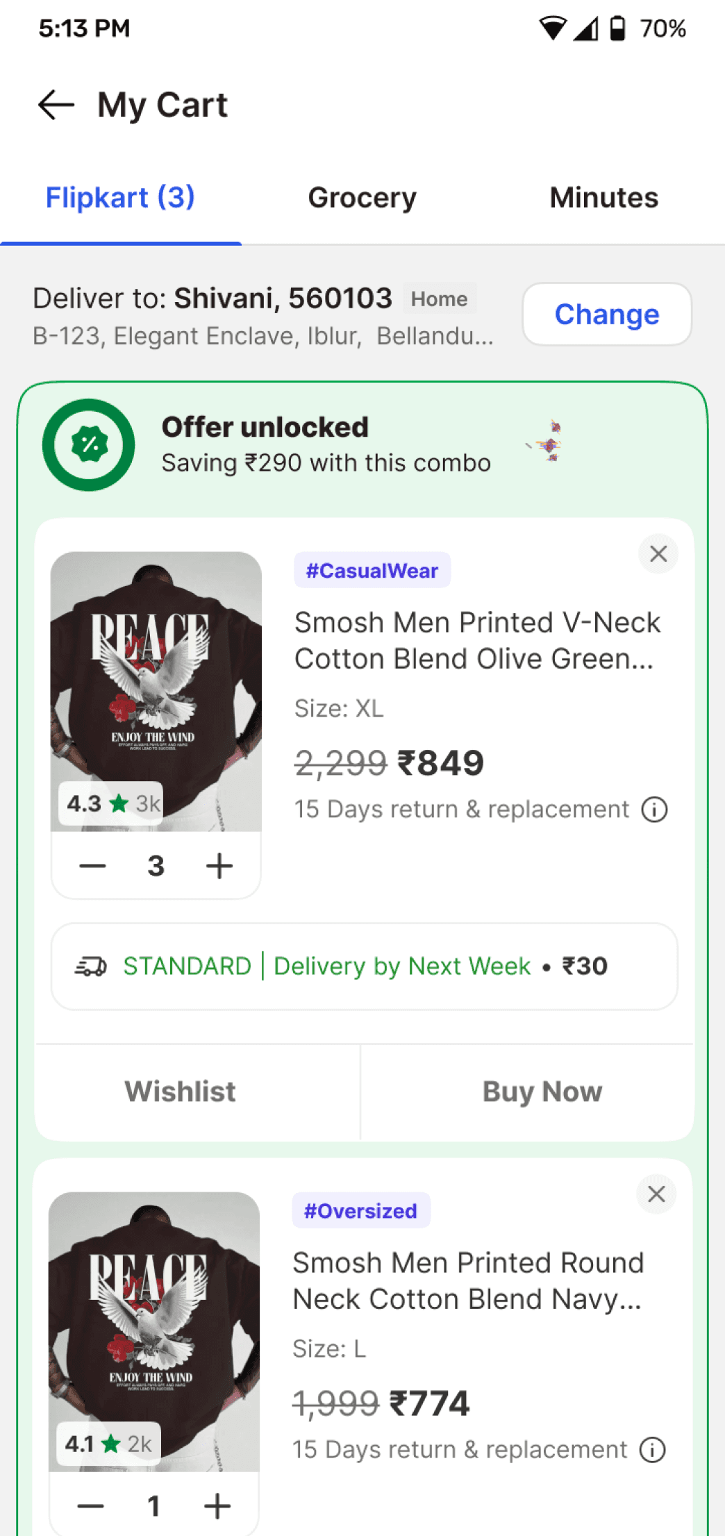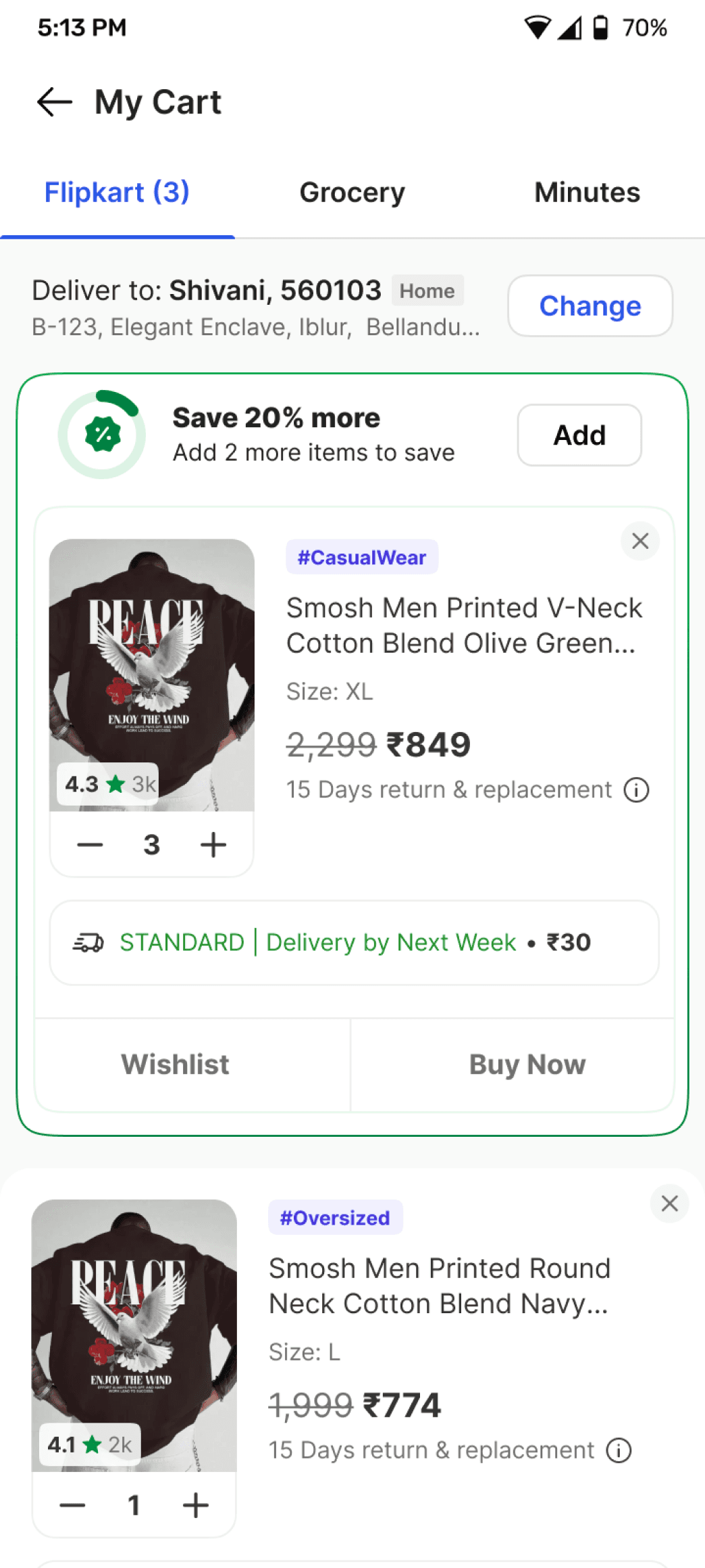 Flipkart's catalogue spans radically different categories — any bundling logic needed to work across fashion, electronics, grocery, home. I could not disrupt the primary purchase funnel — nudges had to be opt-in, skippable. Internship timeline — research, design, and presentation compressed into one summer.