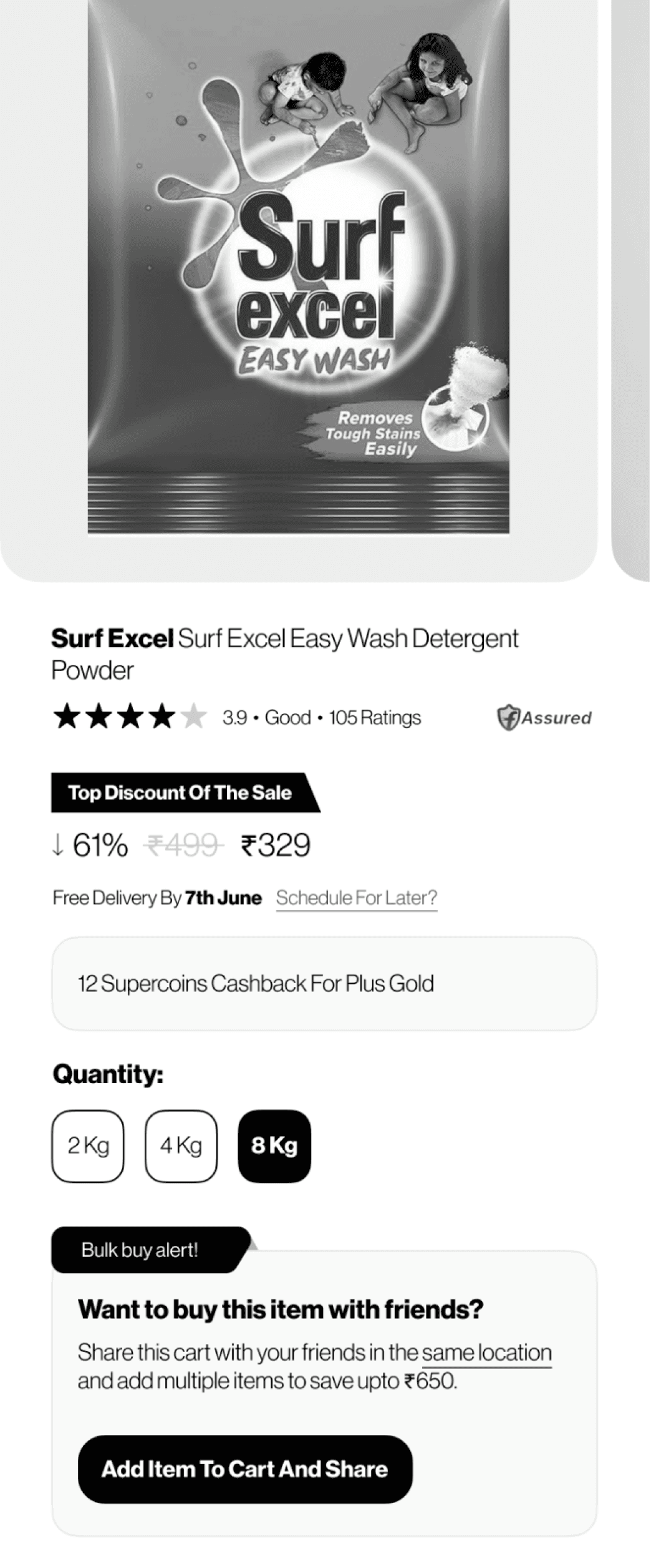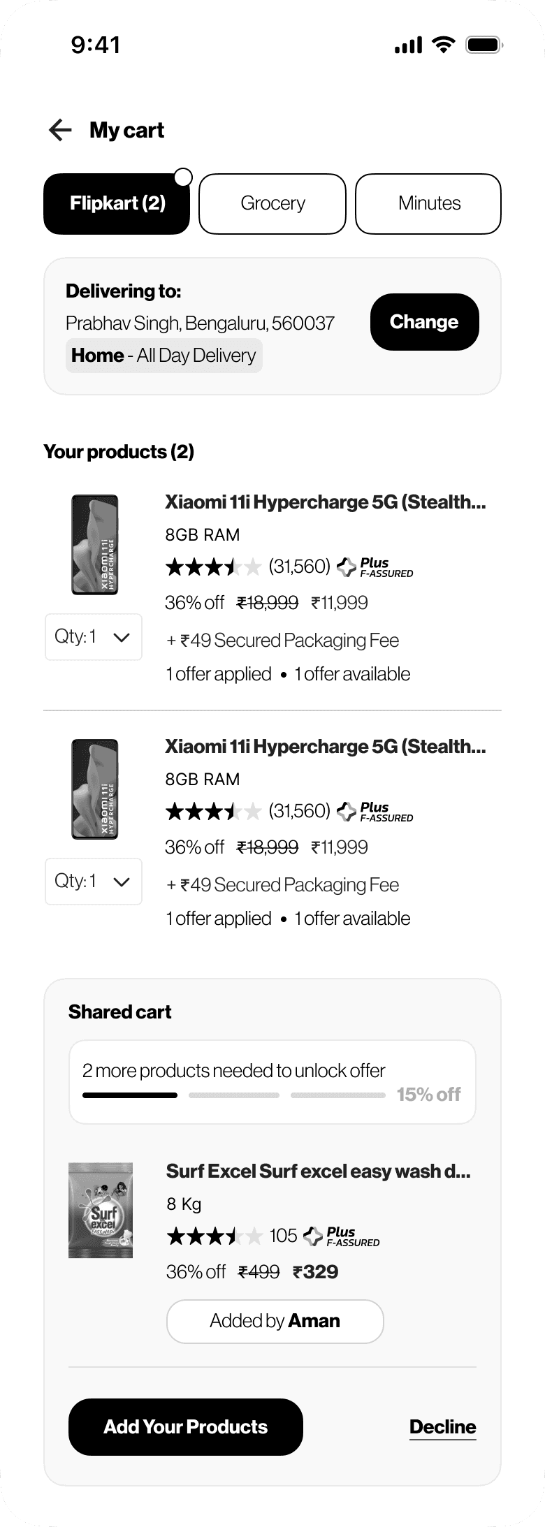 People can share their cart with their friends or family to let them add their desired products and cumulatively place the order from the primary user's account. This saves delivery charges and other small fee that gets added on low value orders.