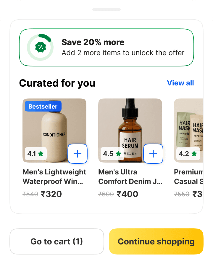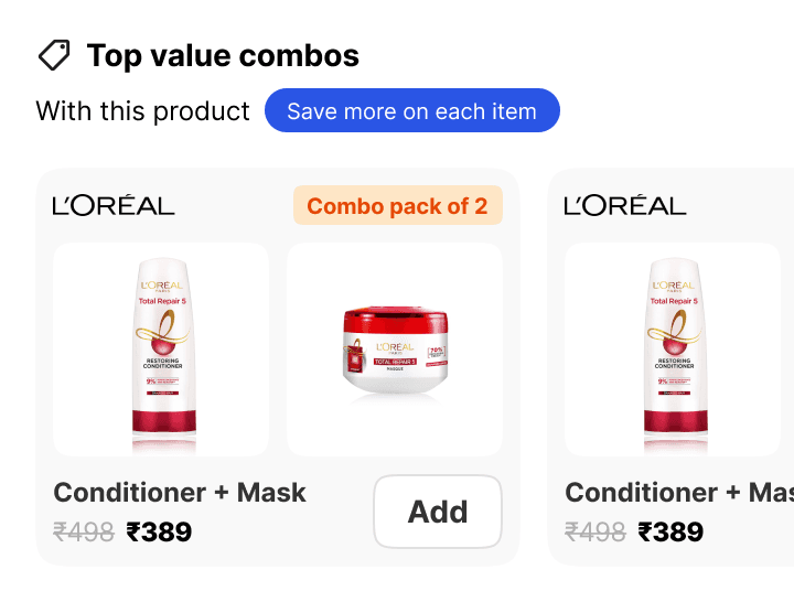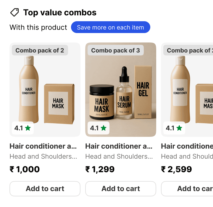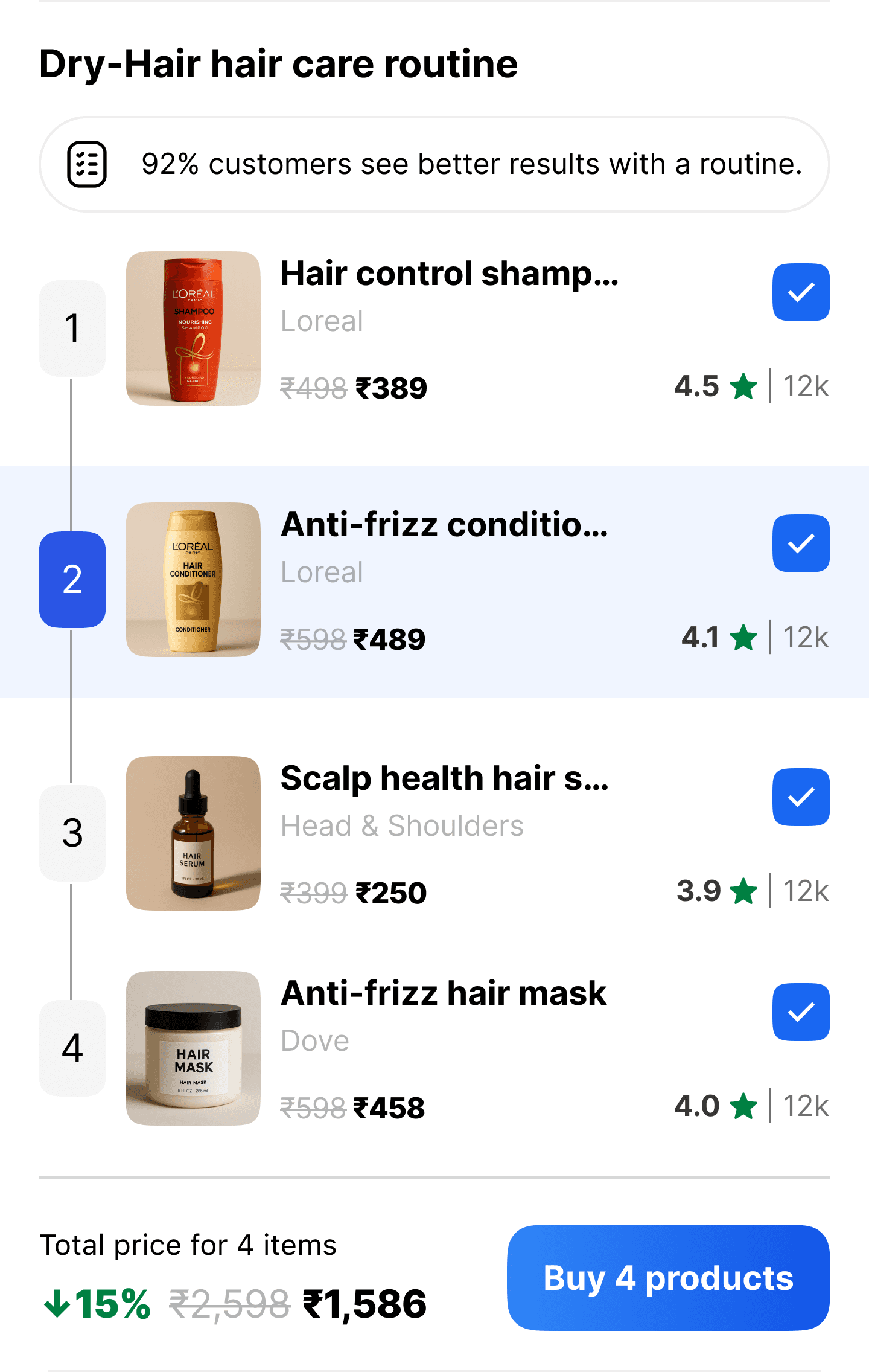 Products from categories like; skincare, haircare etc. are usually followed in a routine. Based on this hypothesis the system bundles relevant products together to make it easy for the customer to make an informed decision to not just purchase one product but by understanding the root cause, purchasing a bundle.
