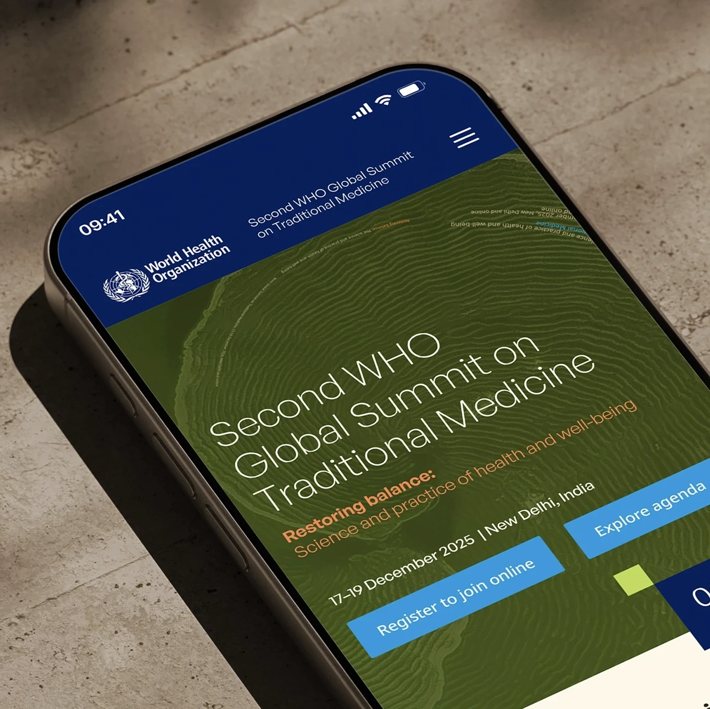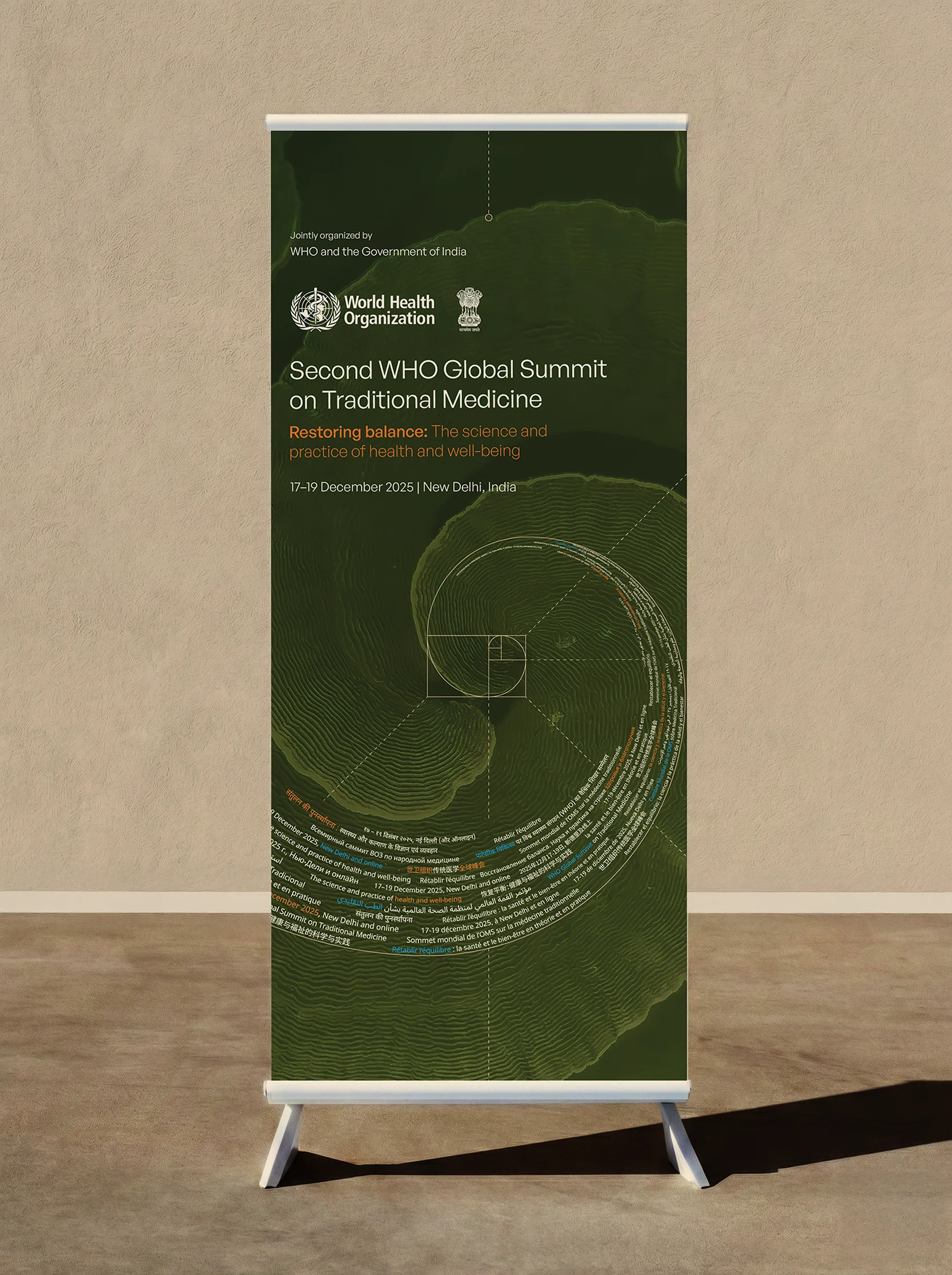 Applied to a summit about Traditional Medicine, it made the argument visually: nature and science are not opposites. The logarithmic spiral is living proof. This gave every deliverable — from the microsite header to the plenary hall backdrop — a shared underlying logic that scaled across contexts without repeating itself.